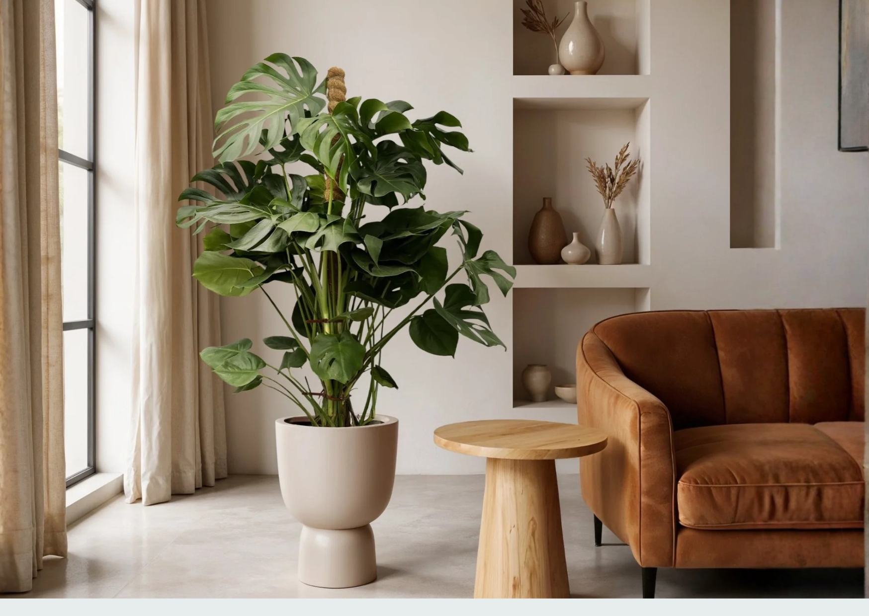 “Die Monstera, auch bekannt als Monstera Deliciosa oder „Lochpflanze”, ist ein echter Klassiker unter den Zimmerpflanzen. Mit ihren großen, glänzenden Blättern voller natürlicher Ausschnitte verleiht sie Ihrem Interieur sofort einen tropischen Look.”