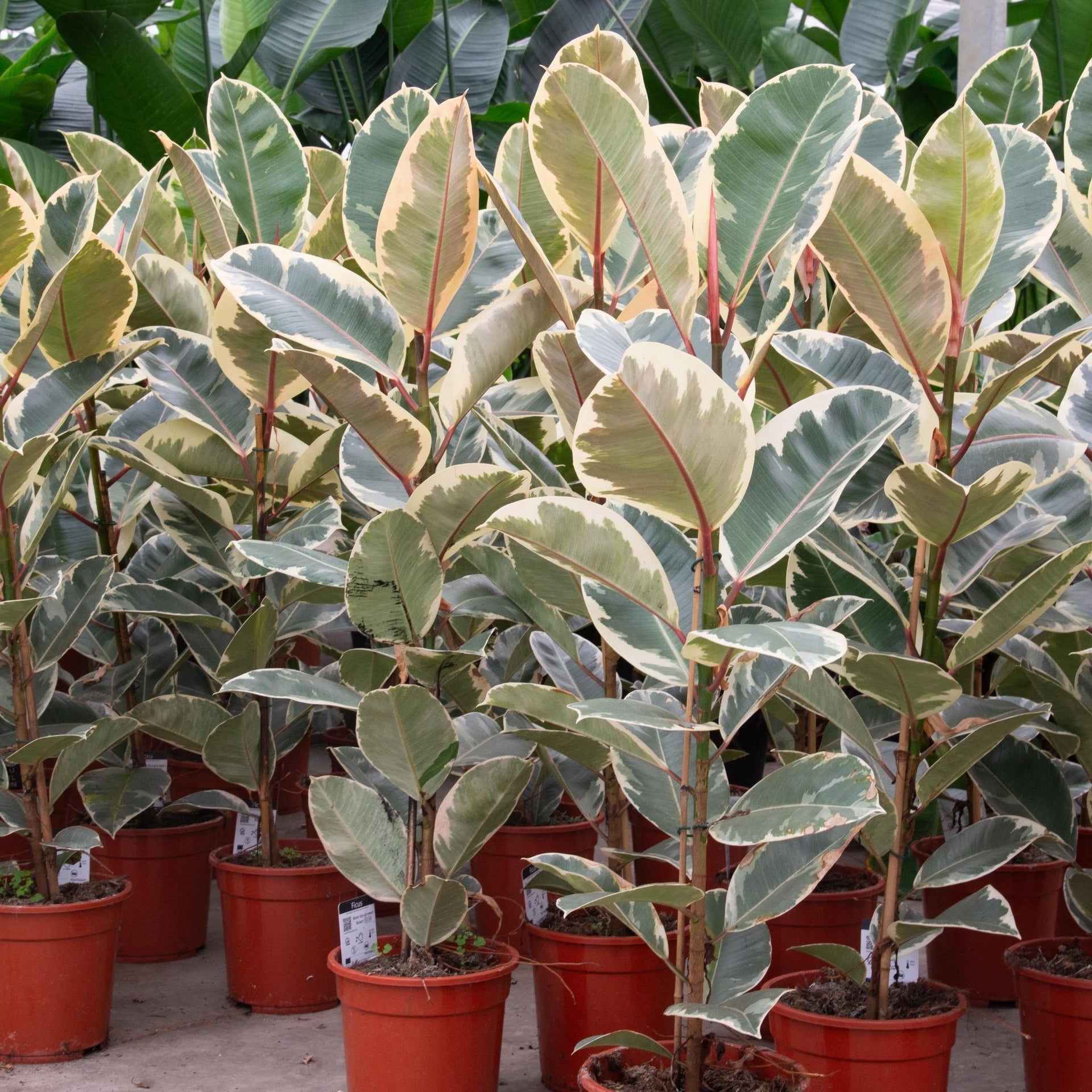 The Ficus Elastica Tineke, better known as the Indian rubber tree, is a striking houseplant with an interesting past. Until the 20th century, this plant was used as a major source for rubber production. The Tineke is a variegated variety within the large Ficus family, which has more than 1,000 species - often so diverse that you don't immediately see that they are related. Most Ficus species originate in tropical Asia, where they grow into impressive trees.