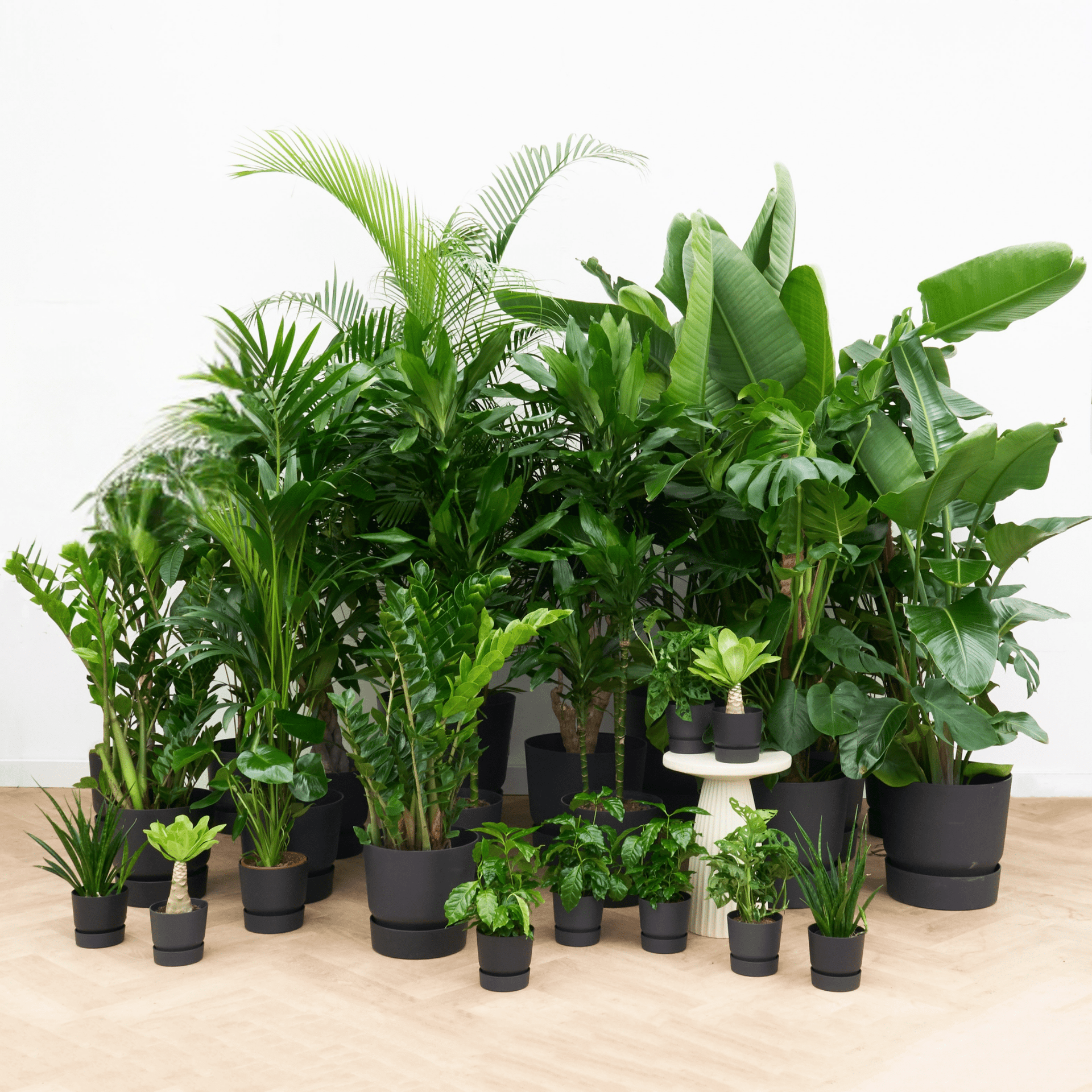This fantastic office package includes 2x Strelitzia Nicolai 170 cm & 1x XL 210 cm, Dypsis Lutescens (Areca palm) 215 cm, Monstera Deliciosa XXL 150 cm, 2x Dracaena Janet Lind XL 160 cm, Dracaena Marginata branched 160cm, 2x Kentia palm 160cm, 2x Zamioculcas 100cm, 2x Sansevieria Kirkii 35cm, 2x Coffea Arabica 15cm, 2x Monstera Monkey Leaf 25cm and 2x Hawaii palm 25cm.