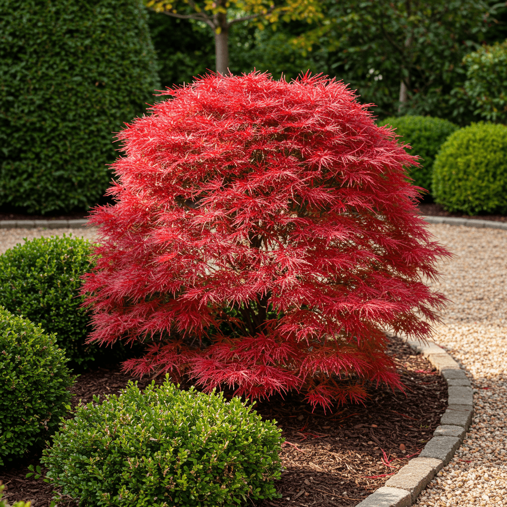 De Acer palmatum 'Shaina' vindt zijn oorsprong in Japan en staat bekend om zijn compacte vorm en dieprode bladkleuren.