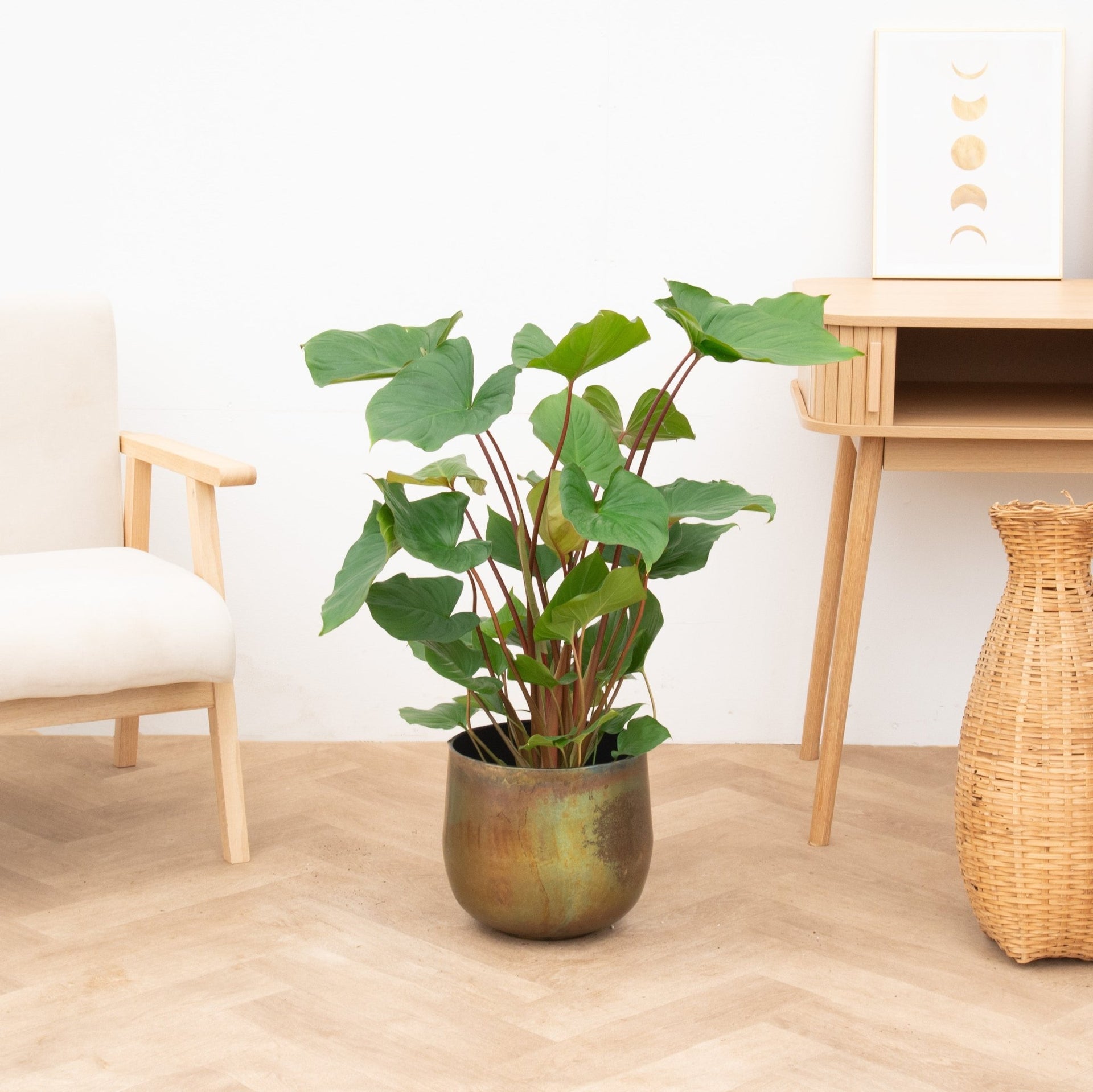 De Homalomena Maggy vindt haar oorsprong in de tropische regenwouden van Zuidoost-Azië, waar ze uitgroeit tot een compacte, weelderige plant met glanzend donkergroen blad.