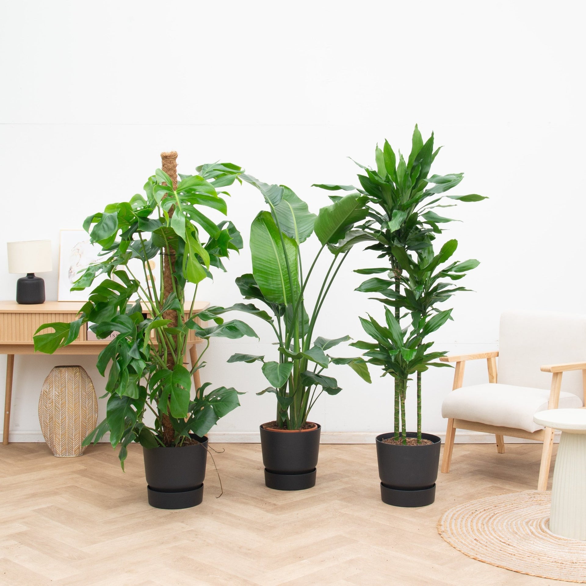 De Strelitzia staat graag in een zonnige hoek, terwijl de Monstera liever wat meer schaduw heeft en direct zonlicht vermijdt. De Dracaena is flexibel, maar floreert het beste bij helder, indirect licht. Samen passen ze zich goed aan aan wisselende lichtomstandigheden op kantoor.