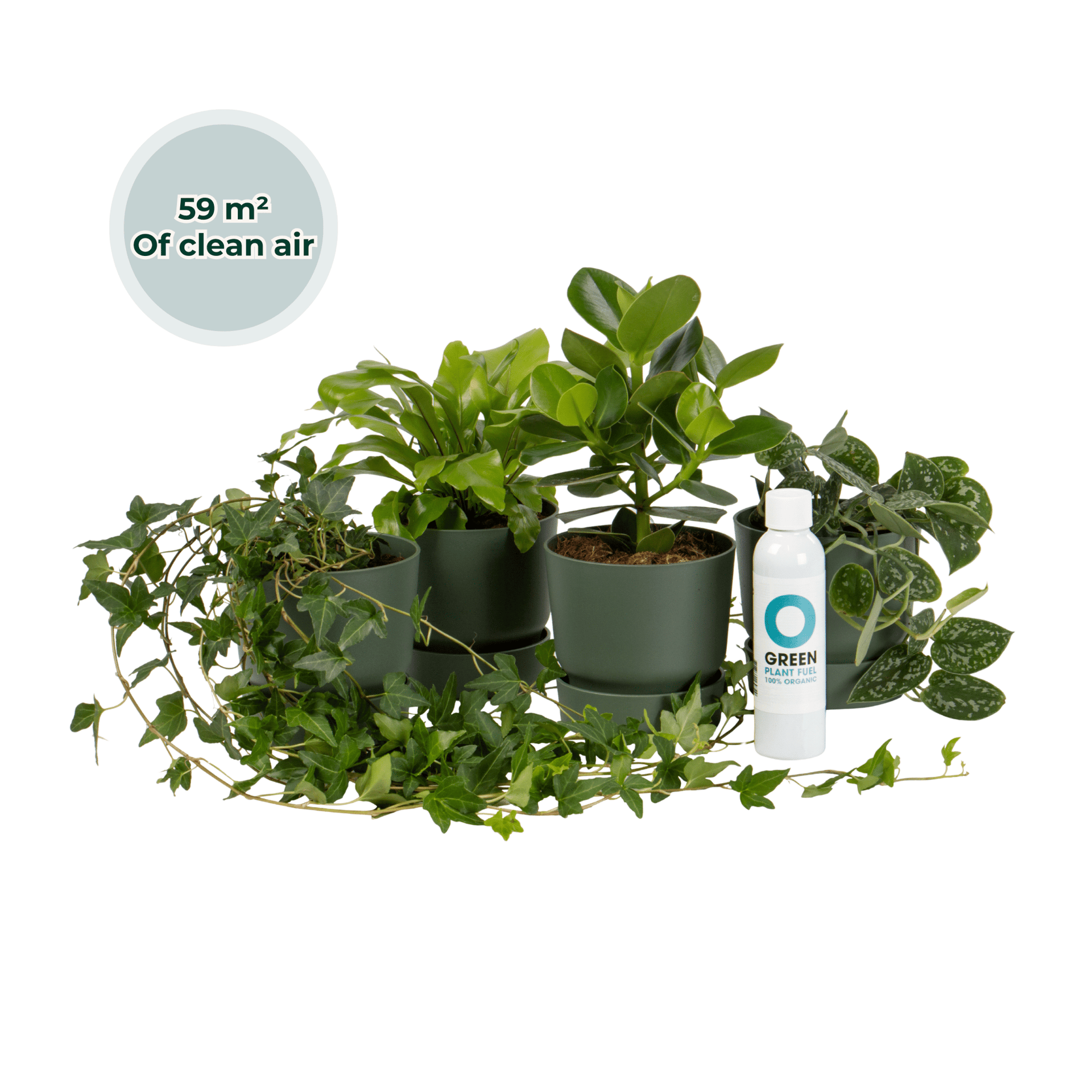 Je krijgt in dit pakket de Asplenium Nidus, Clusia Rosea Princess, Hedera Helix Shamrock en de Scindapsus Pictus Argyraeus samen met een fles plantenvoeding! Dit pakket zuivert gezamenlijk maar liefst 59m²! De planten worden geleverd in vier stijlvolle groene Elho Greenville Round potten (D14 x H13).