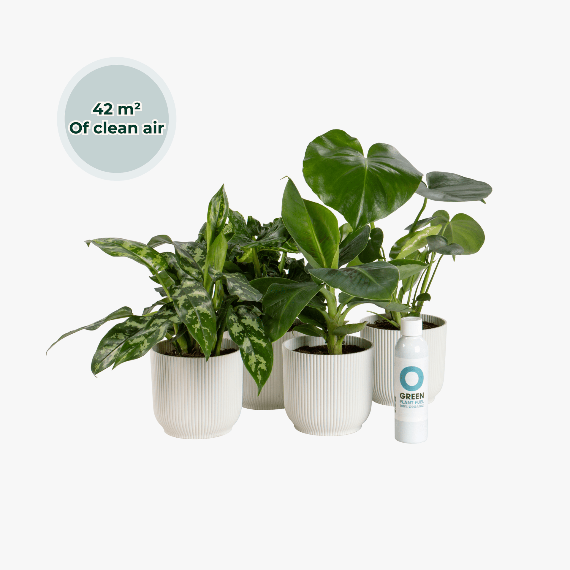Je krijgt in dit pakket de Aglaonema Maria, Bananenplant, Monstera Deliciosa en de Philodendron Atom samen met een fles plantenvoeding en 4x pot Elho Vibes Fold Round wit. Dit pakket zuivert gezamenlijk maar liefst 42m²!