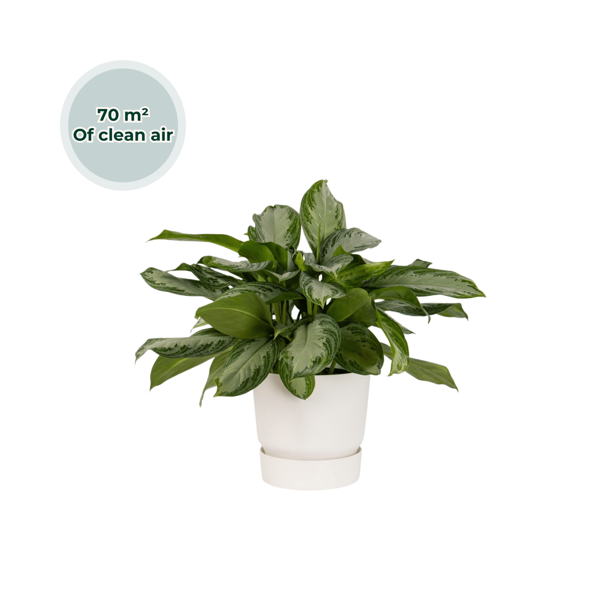 Je krijgt in dit pakket de Aglaonema Silver Bay inclusief pot Elho Greenville Round wit in maat D30 x H28. Deze plant is echt een echte luchtzuiverende topper want hij zuivert maar liefst 70m² in zijn eentje!